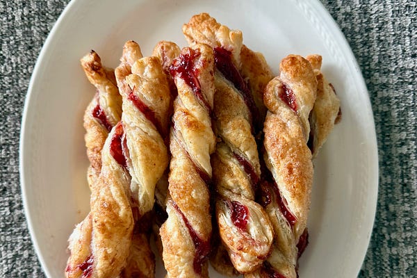Golden, flaky twists with cinnamon sugar and a ribbon of tart raspberry.