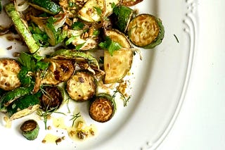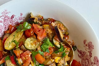 A hearty, rustic French stew of fresh garden vegetables made quick & easy in a skillet, served with roasted yam.