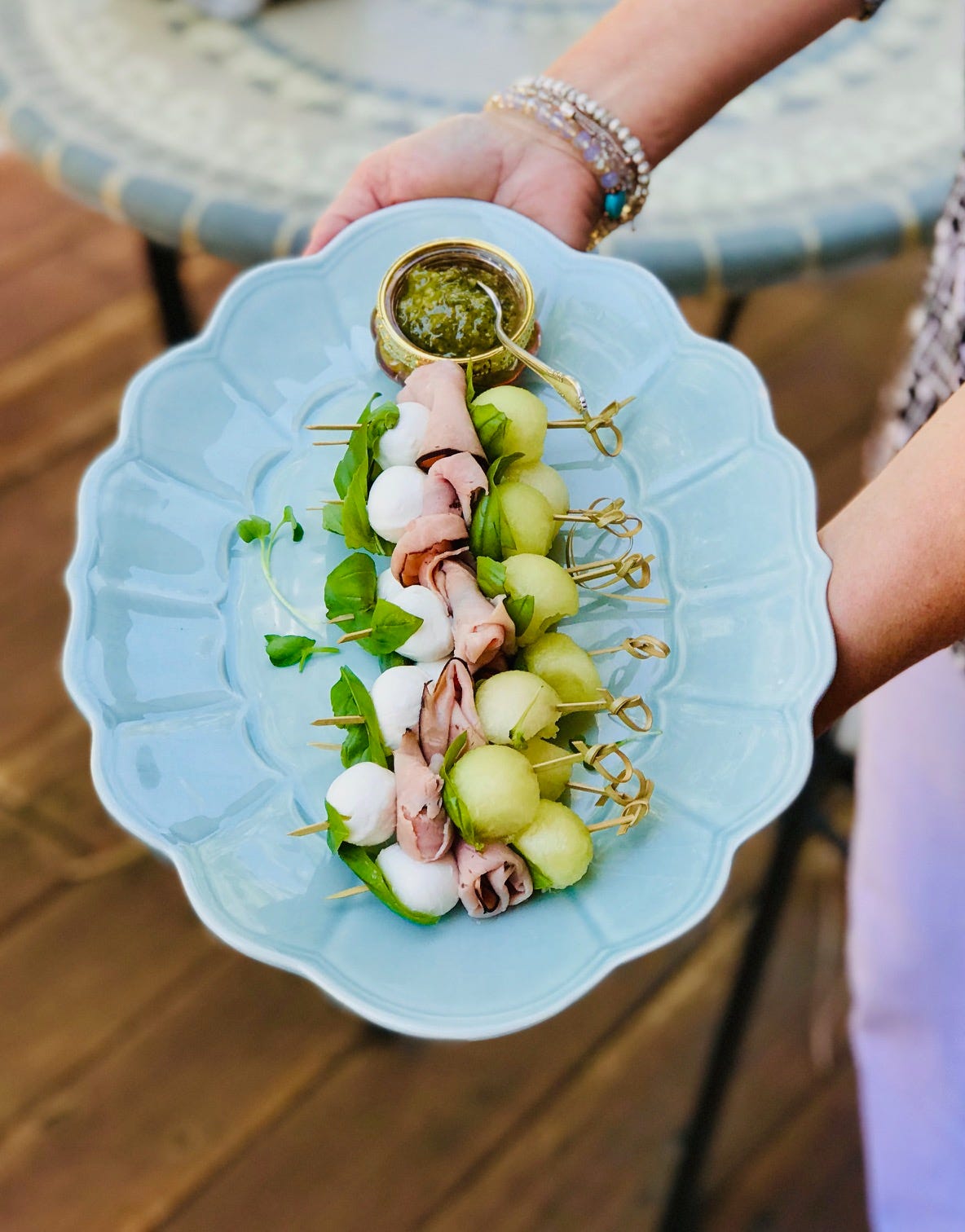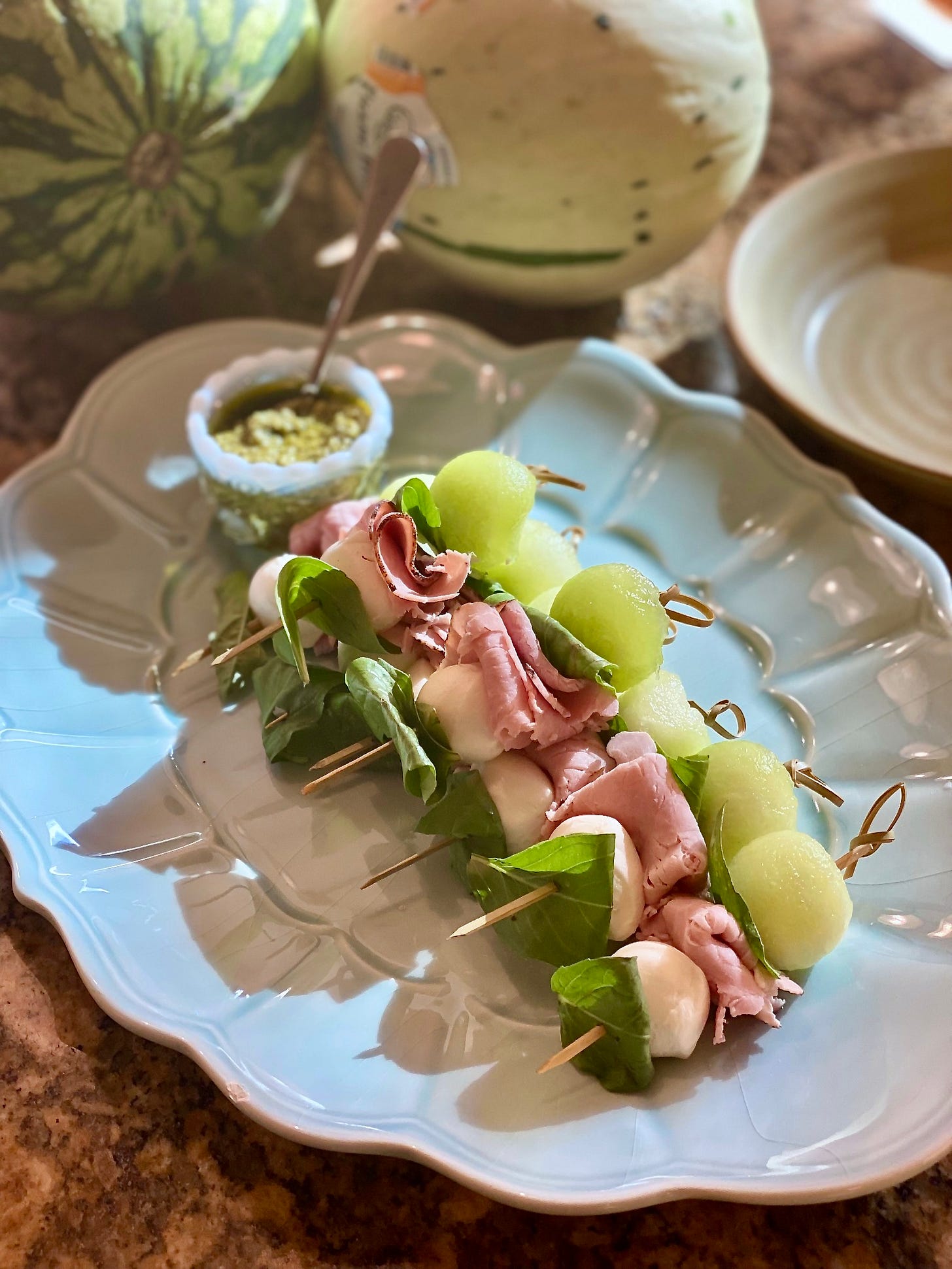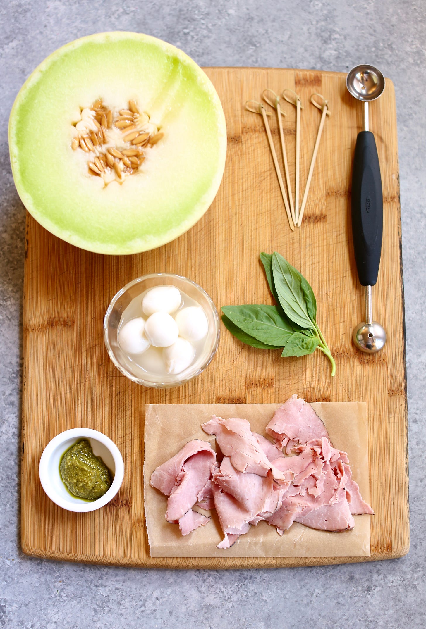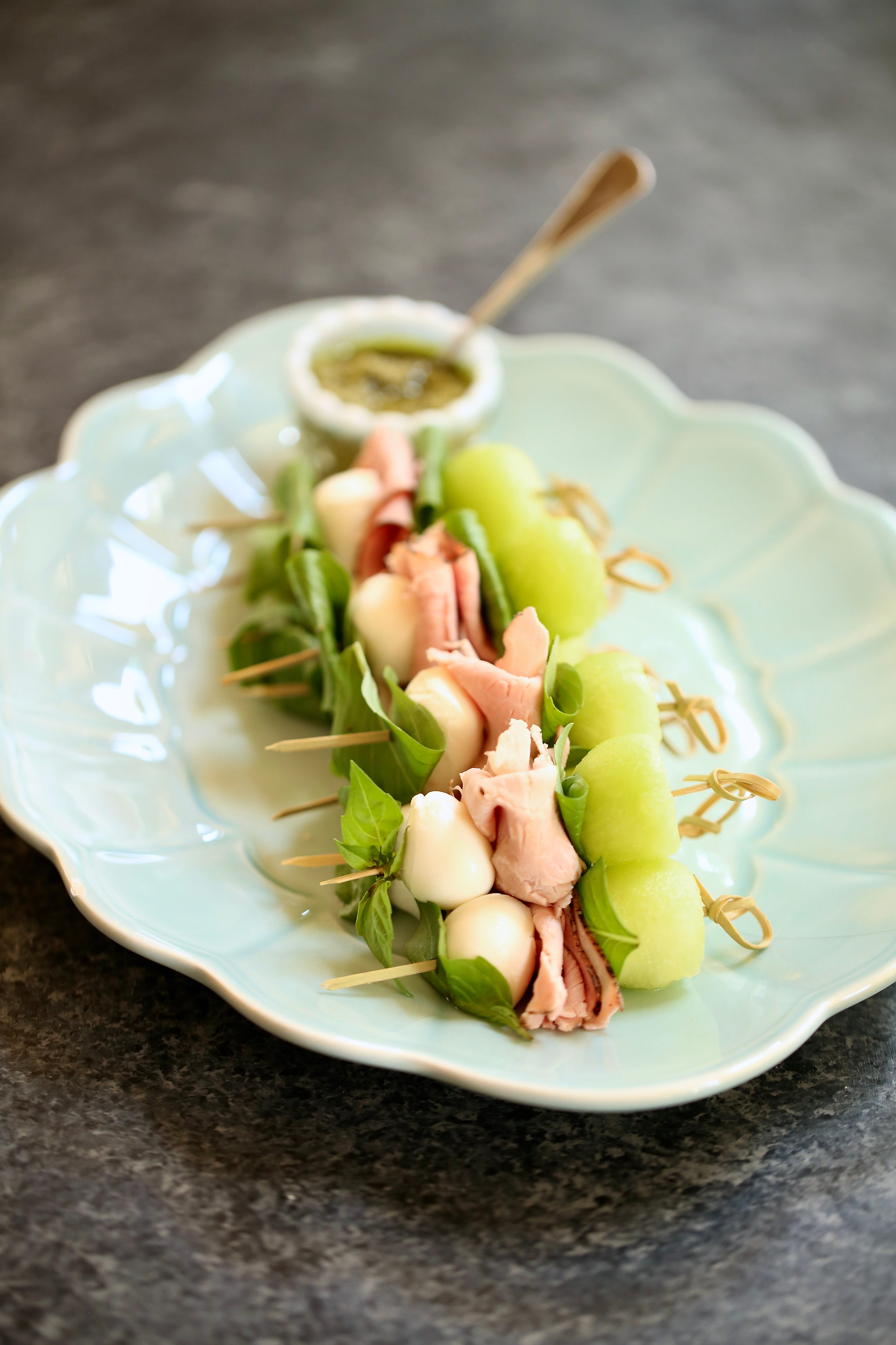 Scoop some melon balls, thread them onto skewers with basil, folded ham, and mozzarella, then arrange everything on a platter with a bowl of pesto for dipping. Slightly messy, very low effort.
