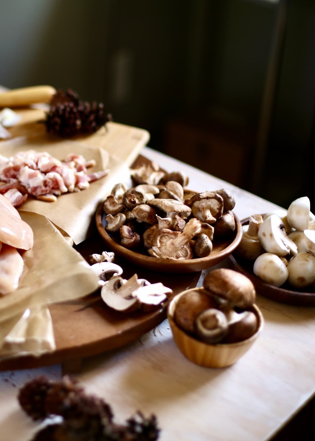 Make a fabulous mushroom sauce with bacon, three varieties of mushrooms, shallots, garlic, tomato paste and Marsala wine.