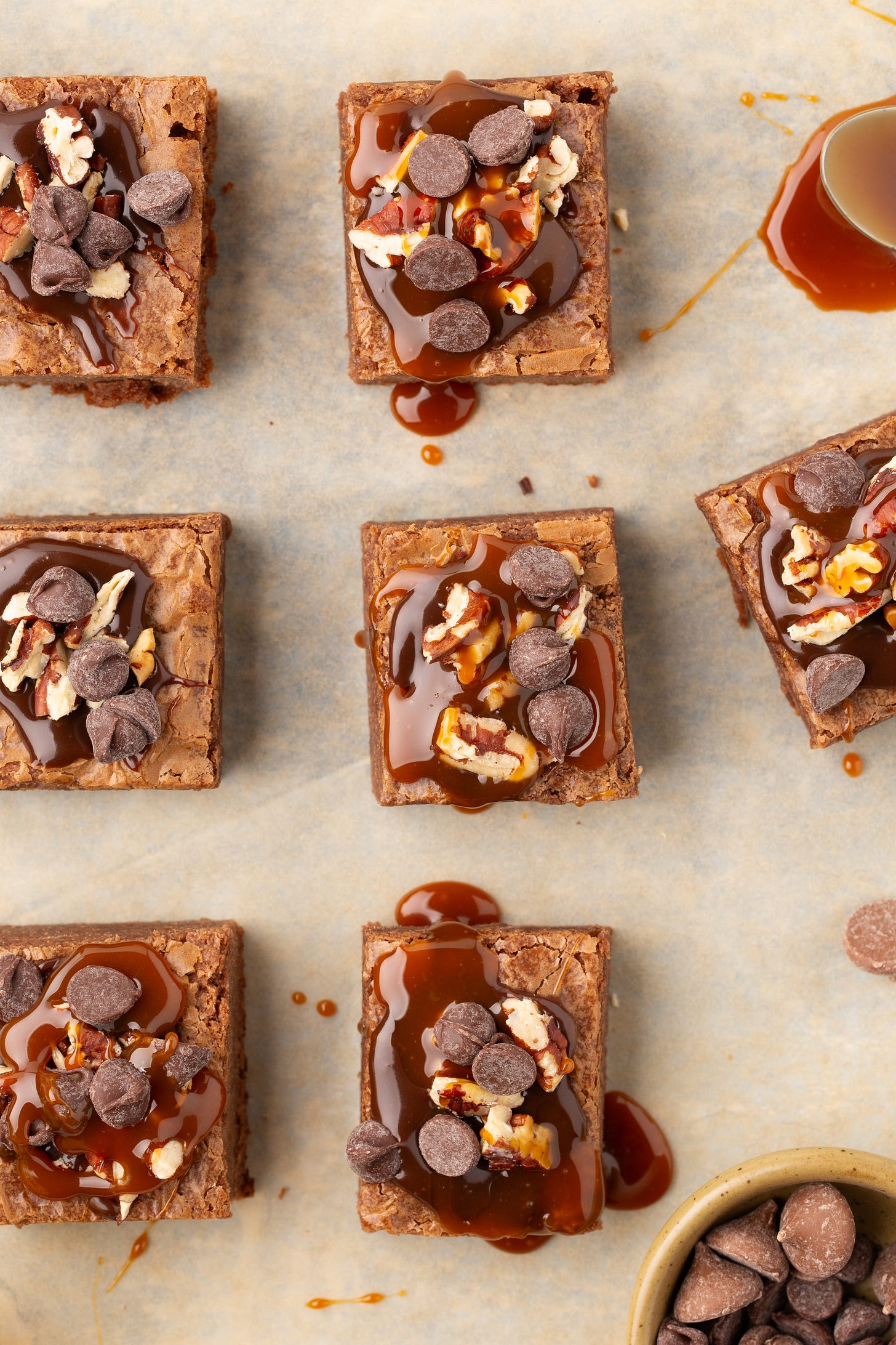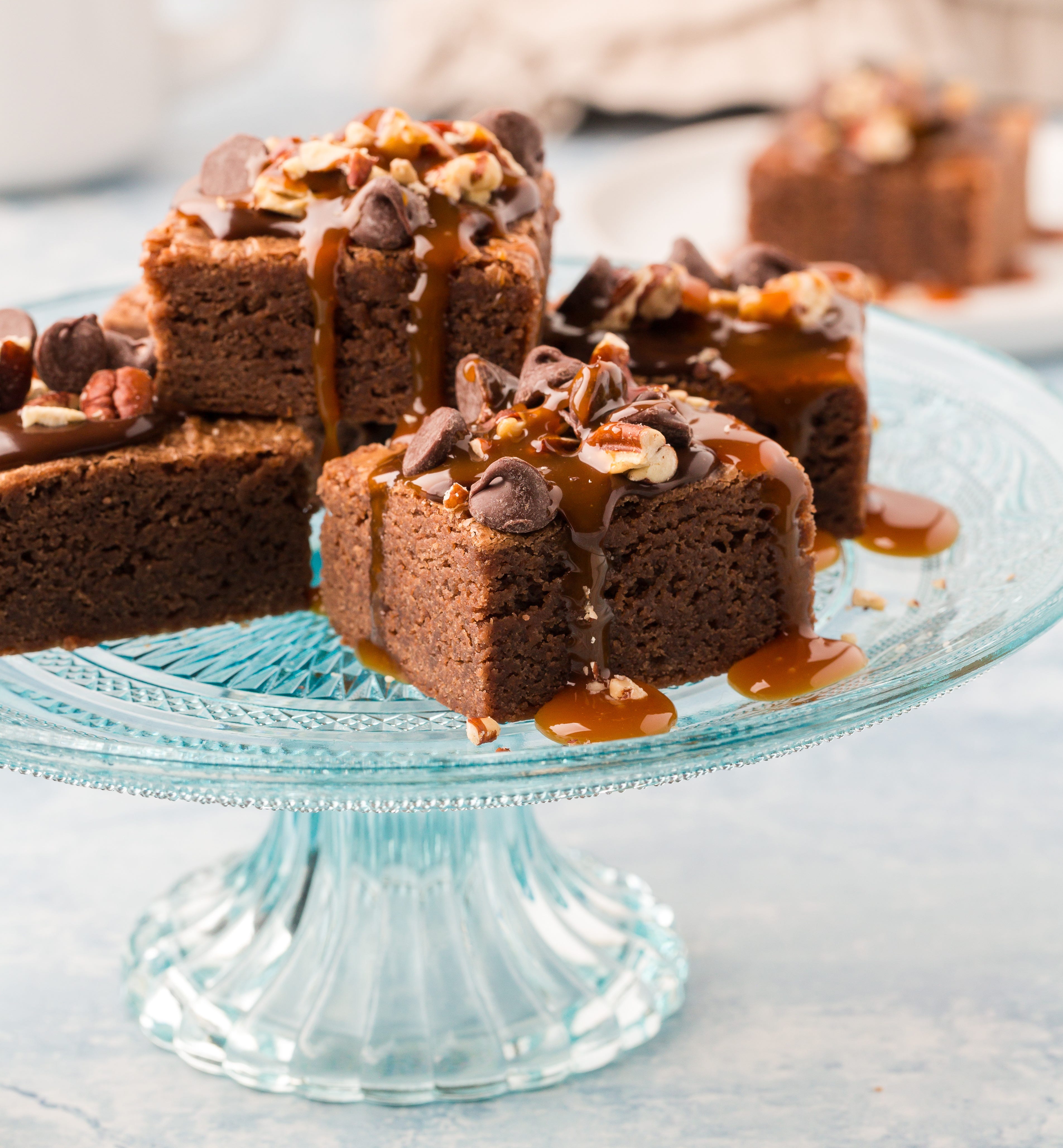 Cut the brownies into portions, then drizzle a little of the melted caramel sauce over each top as well as a few pecans and semi-sweet chocolate chips. Sprinkle with flaky sea salt, if desired.