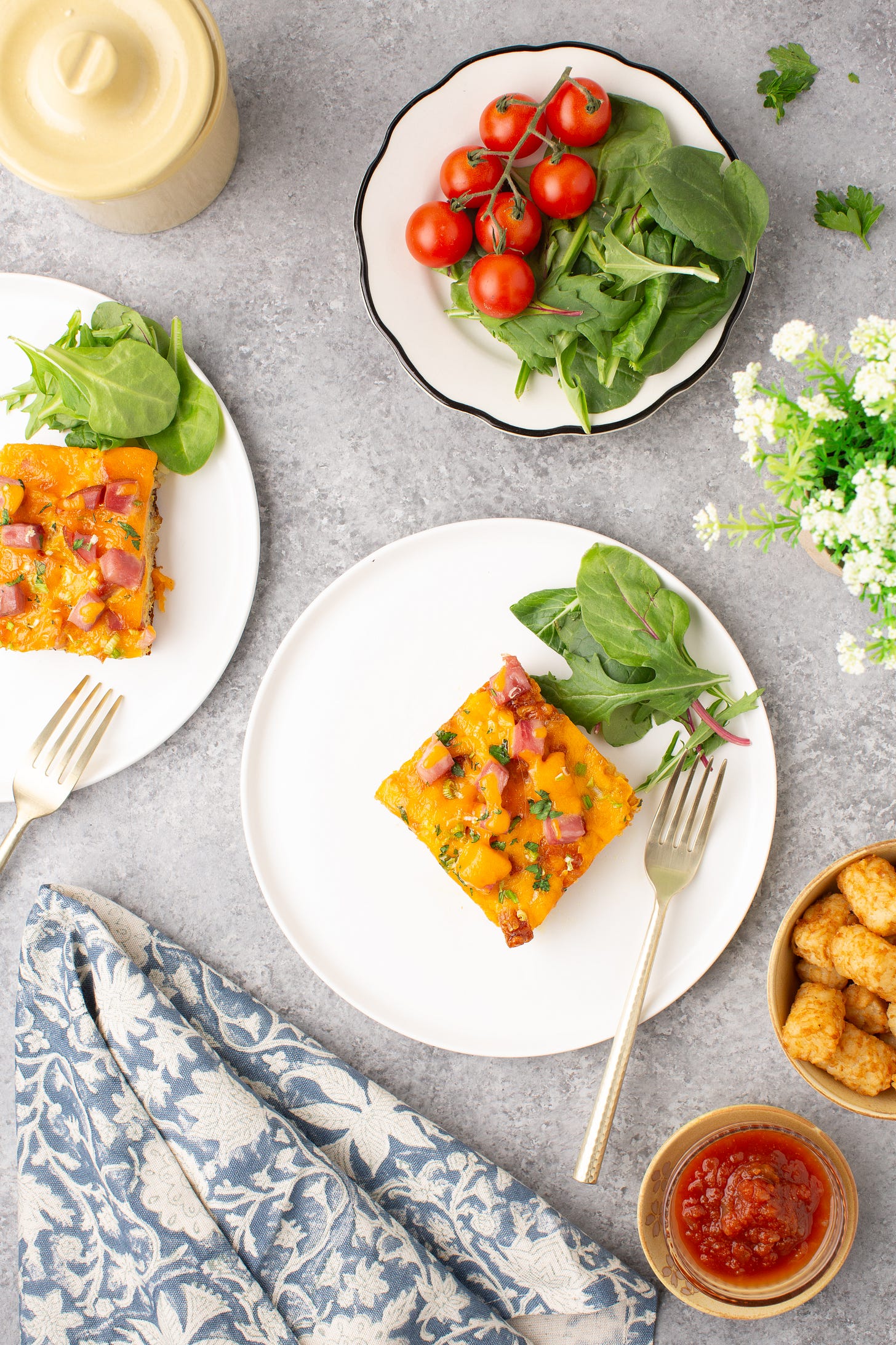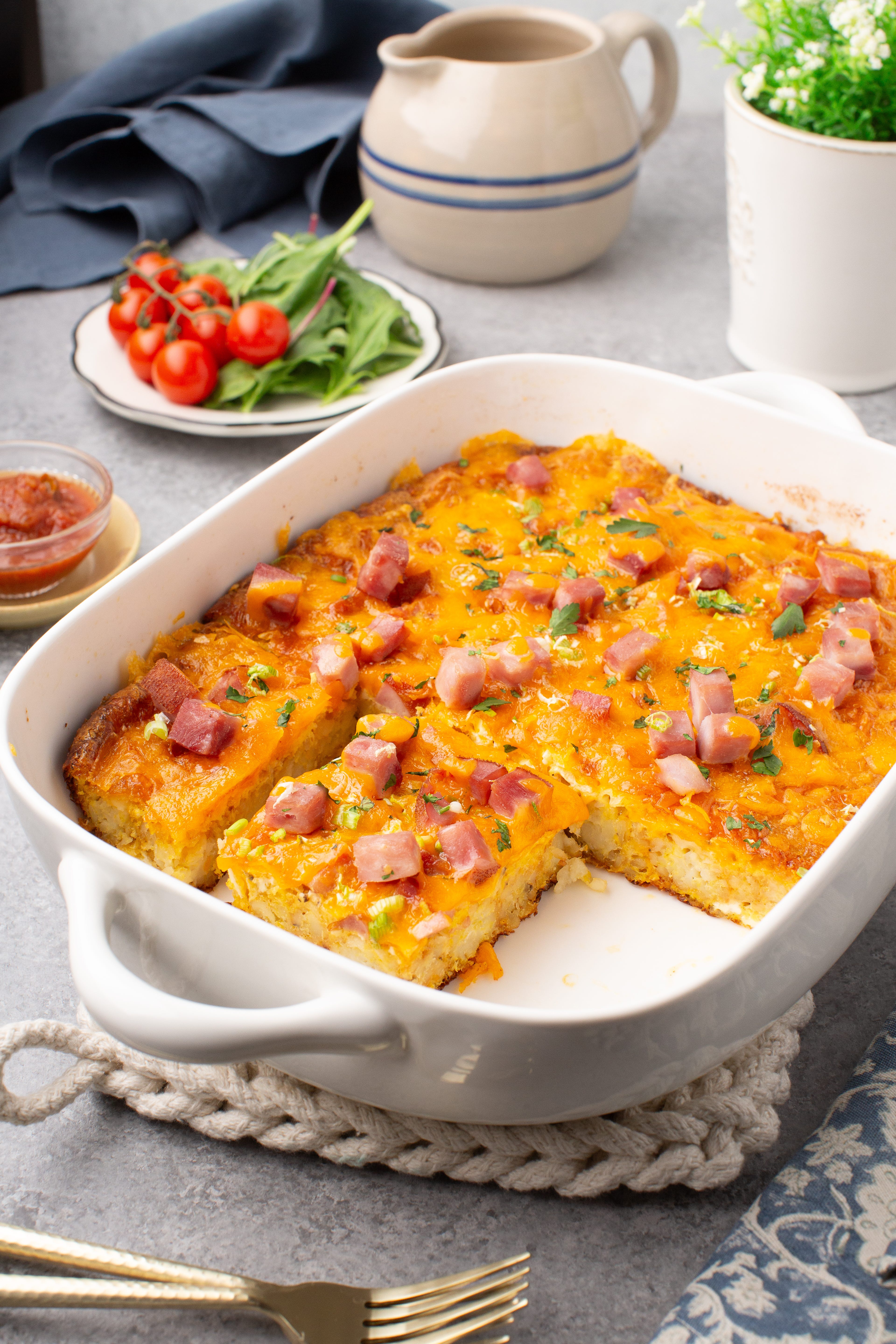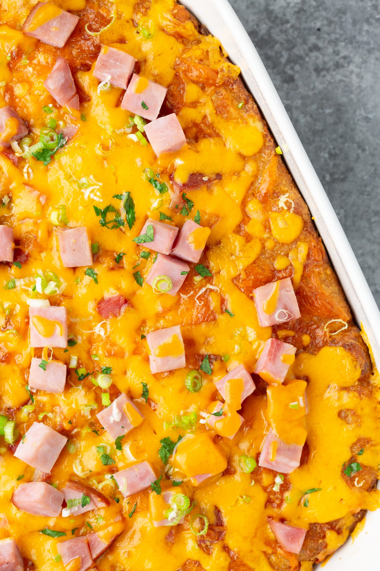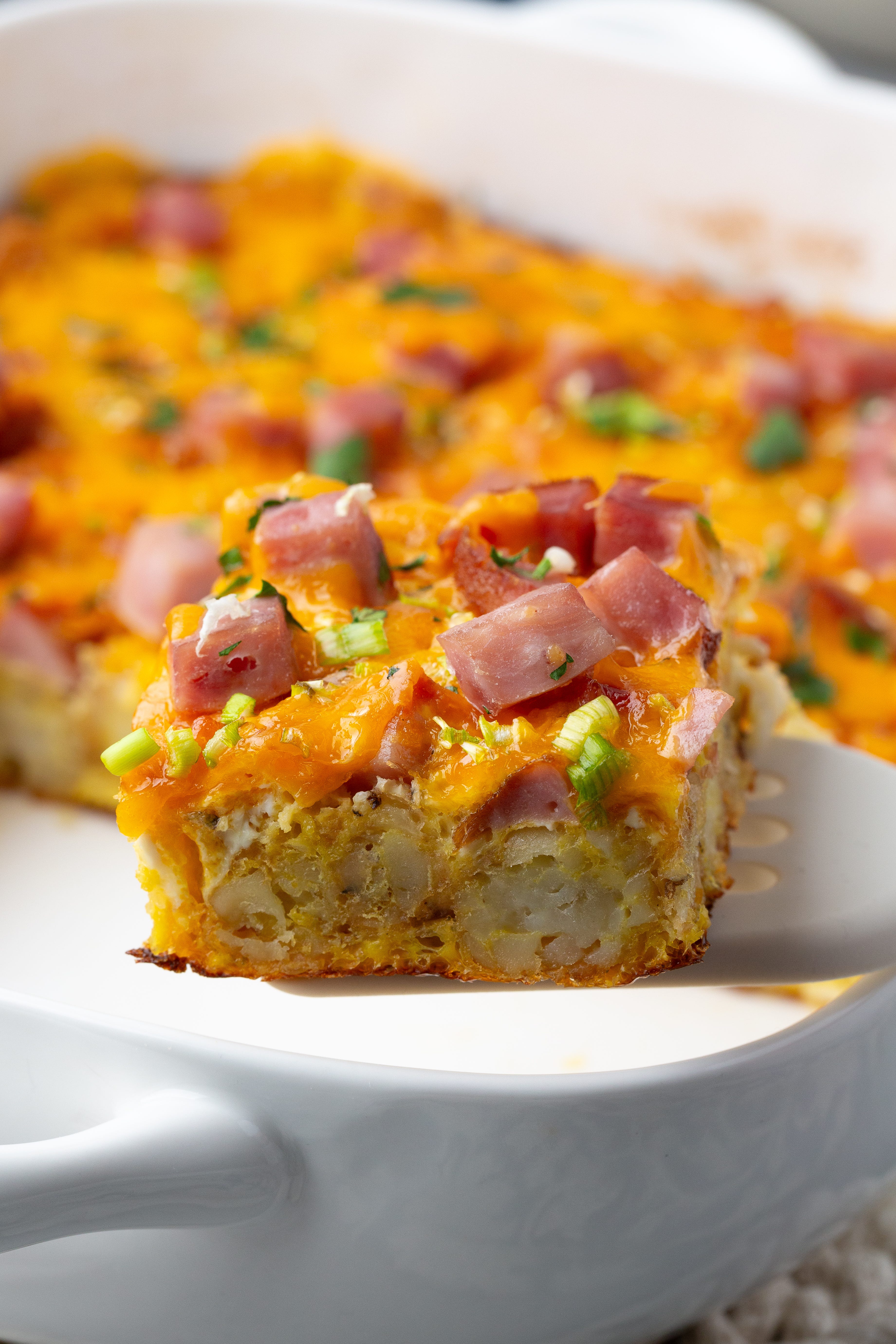 It’s unapologetically cheesy, sure — but it’s also packed with glorious tater tots: crispy, golden, and crowned with juicy cubes of ham steak, then baked with a creamy, savory custard that ties it all together.