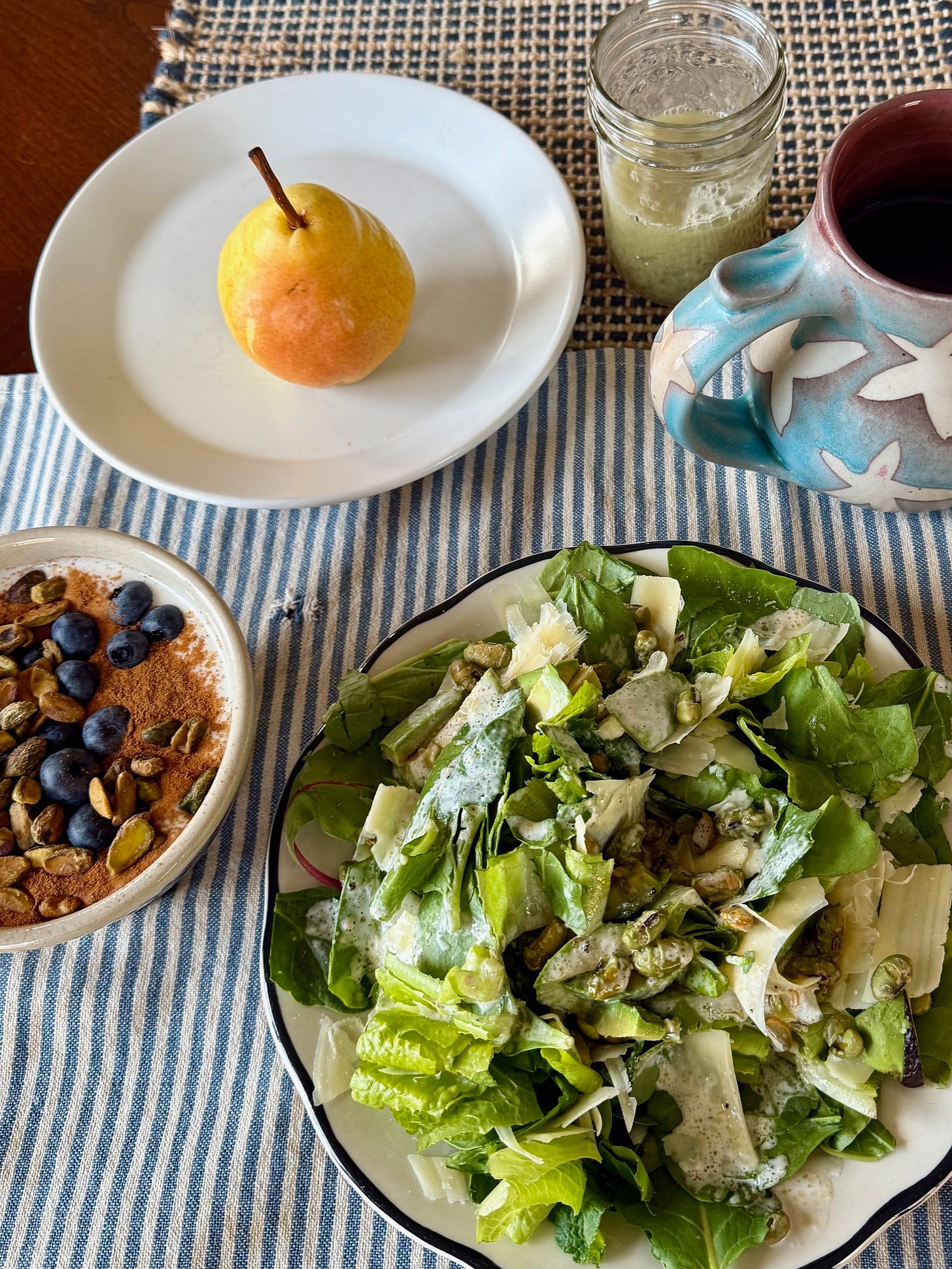 So I went on a brief bender of green salads topped with crispy edamame, shaved Parmesan, and a lemony vinaigrette, along with bowls of plain yogurt finished with a generous shake of cinnamon, fresh blueberries, and salted pistachios. Celery juice, mugs of decaf green tea, and a very nice pear rounded things out.