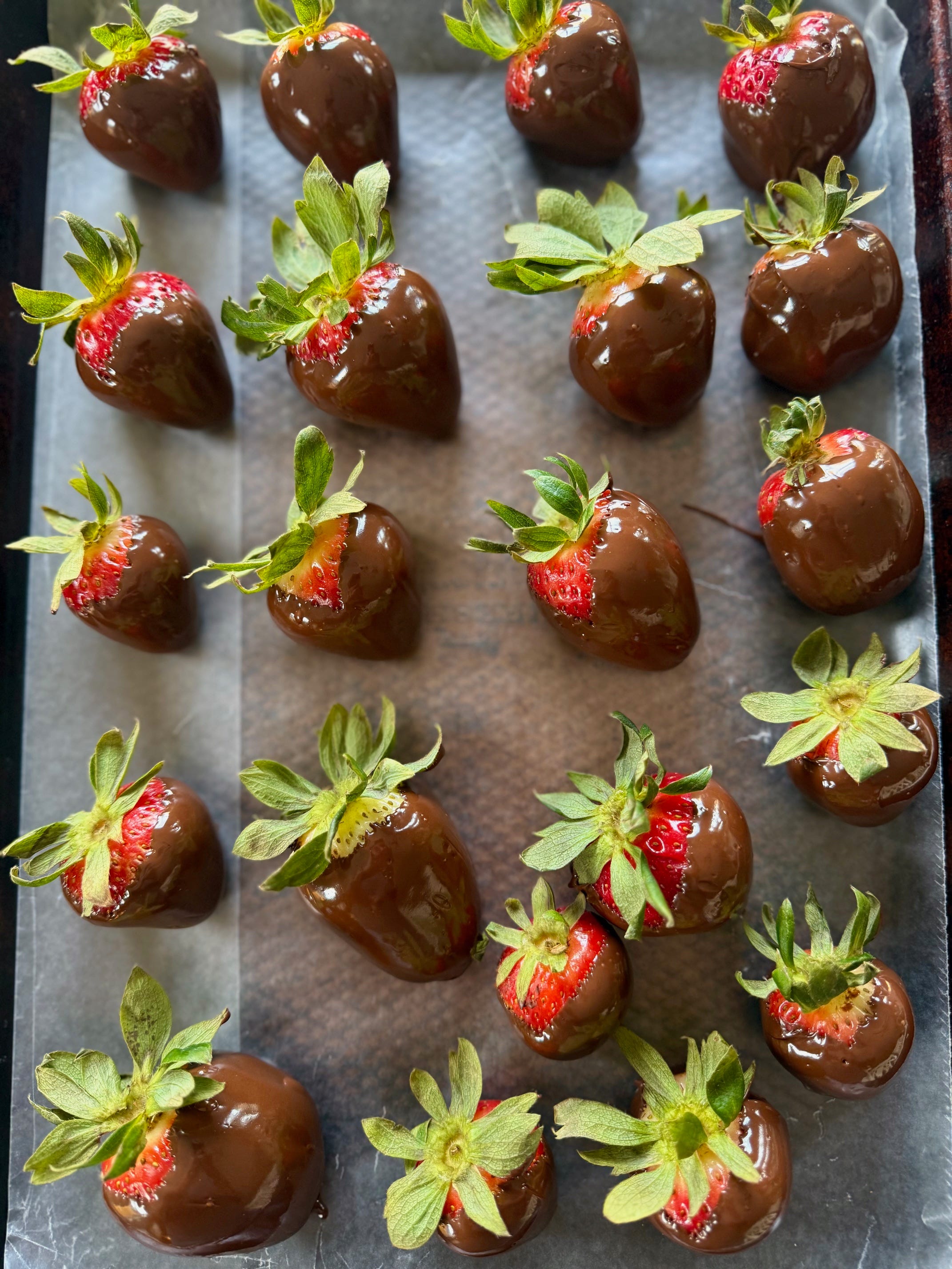 To make your own, gently hold the strawberries by the stem and give them a good dunk in melted chocolate, then set them on a baking sheet lined with waxed paper.