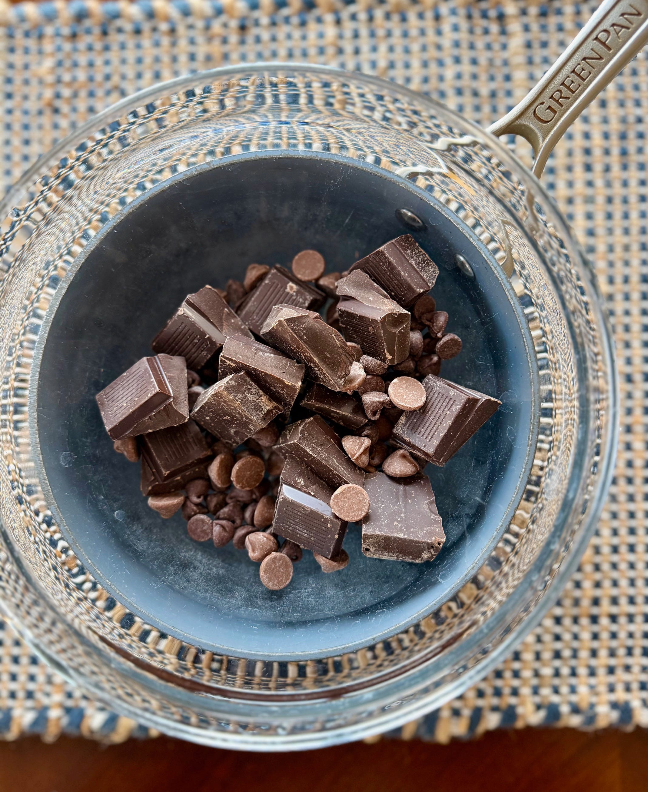 Thankfully, I happened to have a sizable block of Belgian dark chocolate from Trader Joe’s on hand, which I chopped into small pieces and combined with a handful of Guittard milk chocolate chips for good measure.