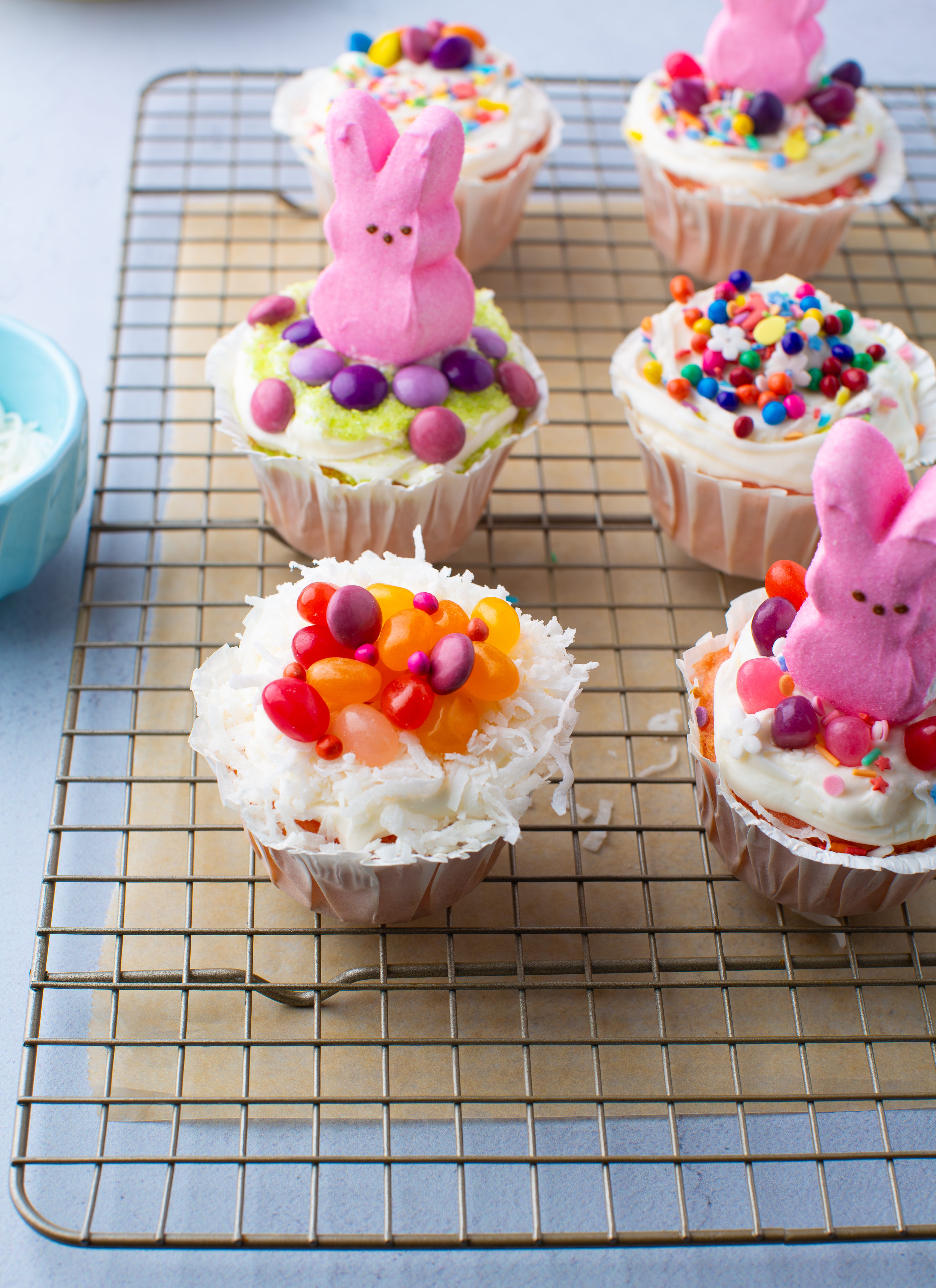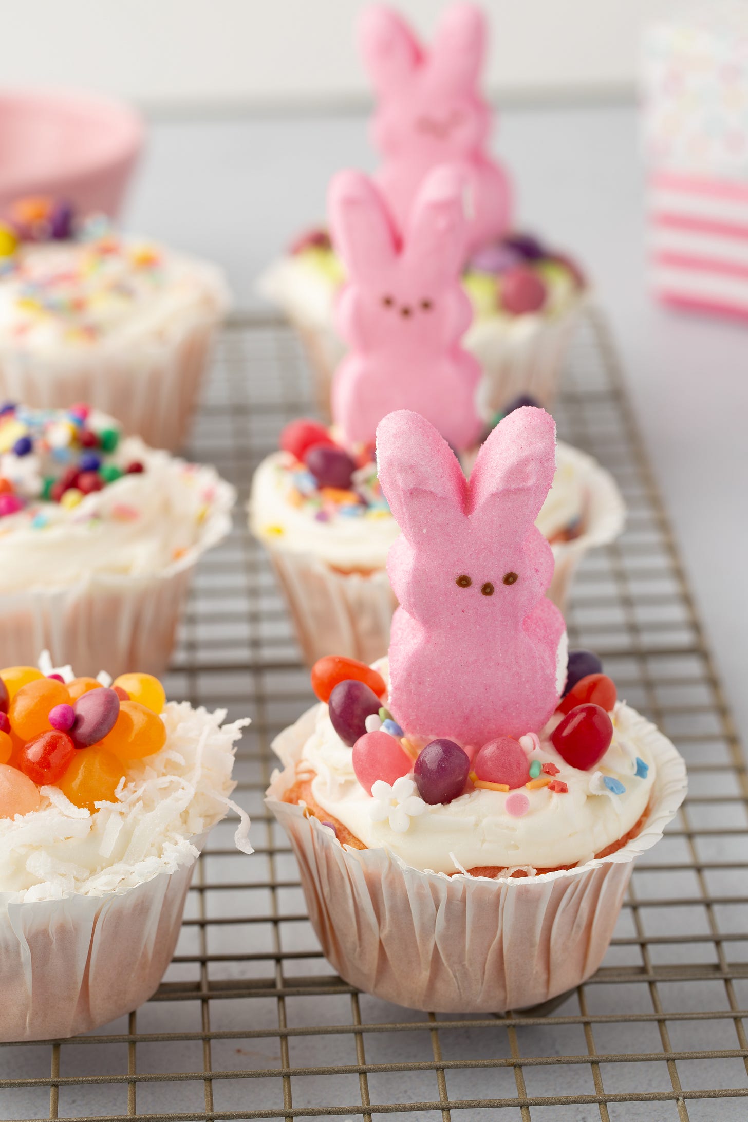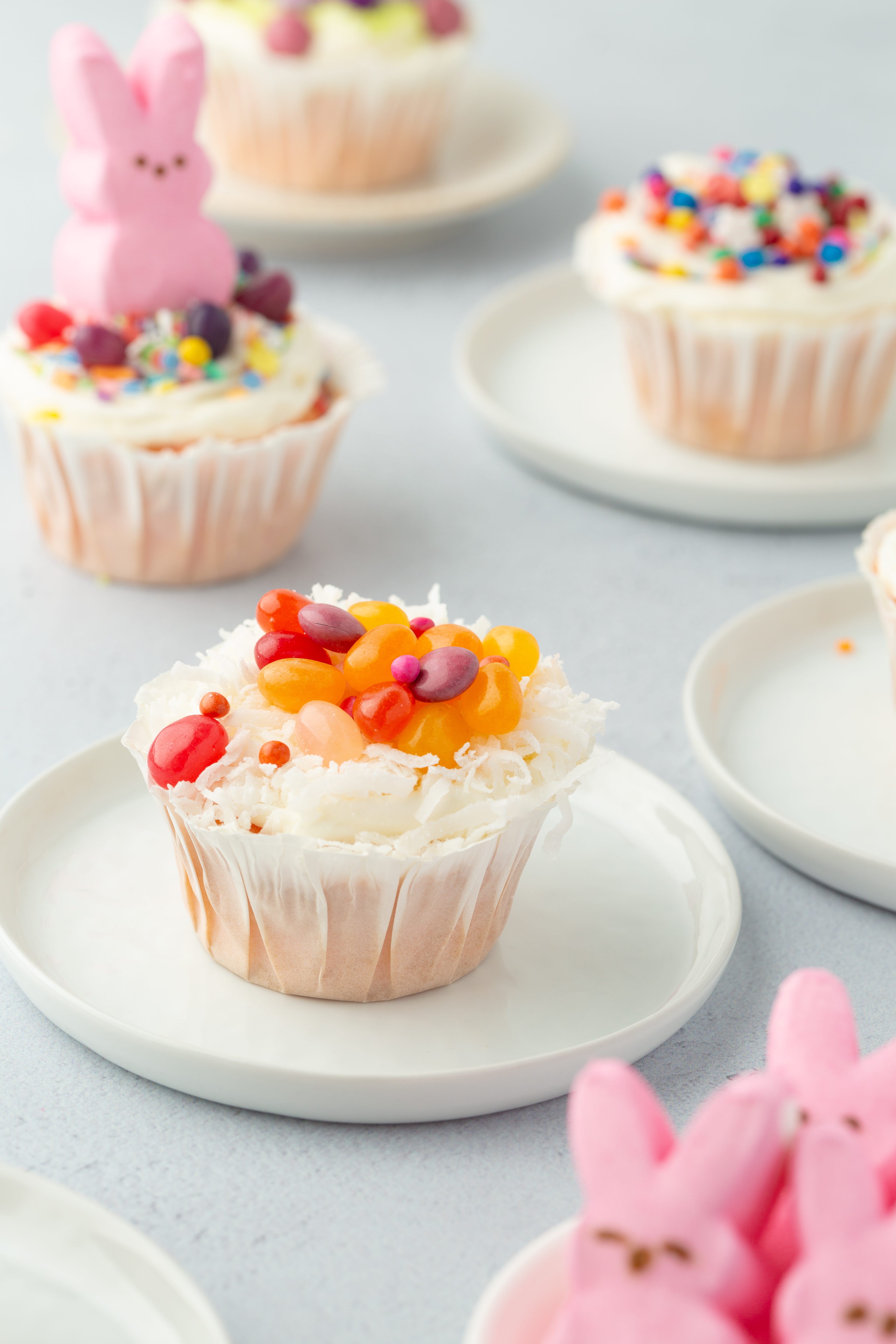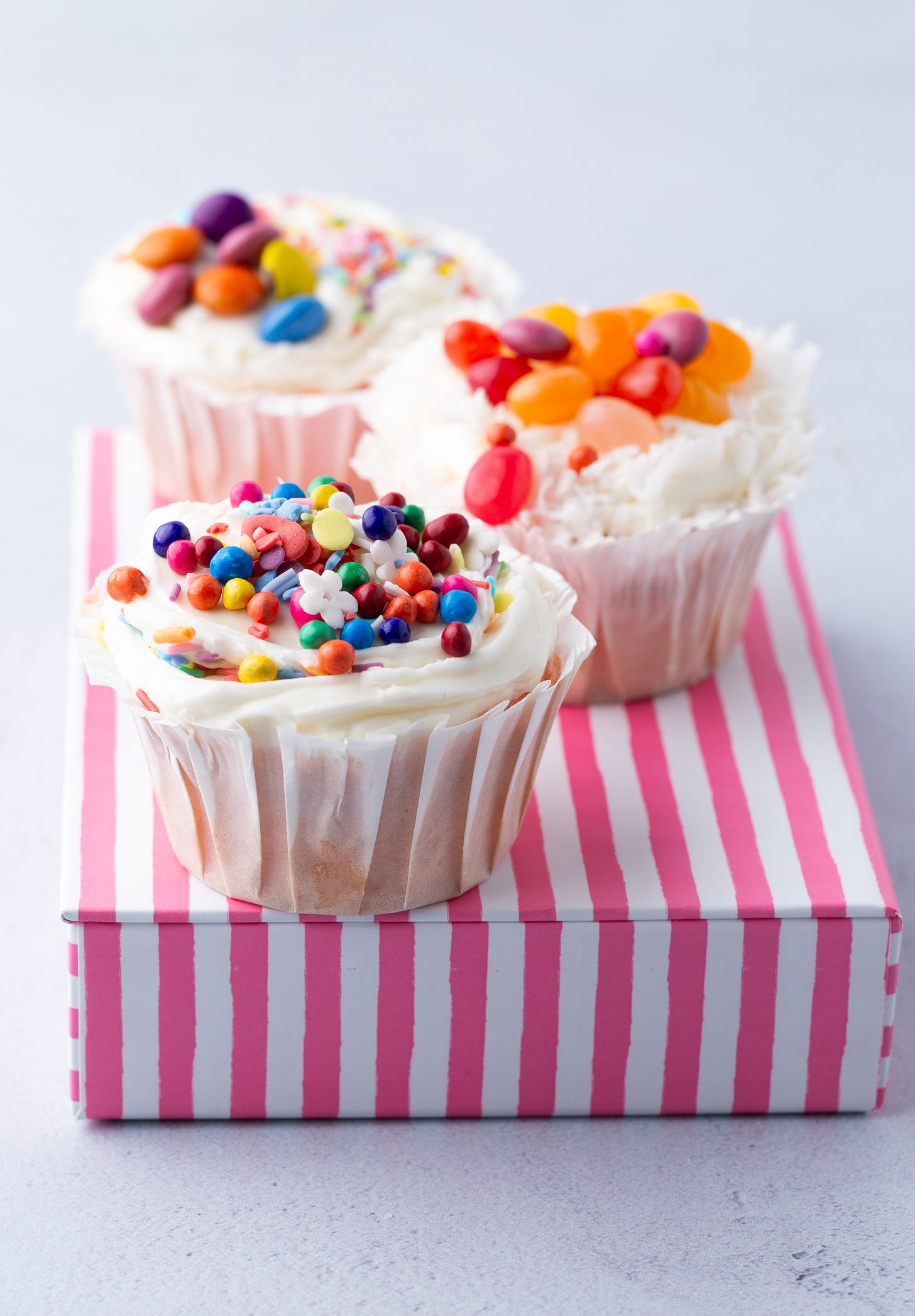 Use contrast for a prettier cupcake. A light frosting with bright berries or sprinkles gives you the nicest spring look.