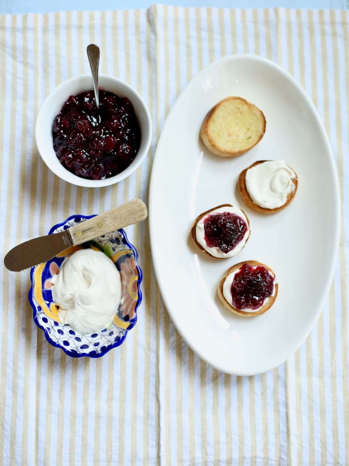 Spread some of the goat cheese mixture on bread that's been toasted under a broiler with a little olive oil, then top with the completely cooled cranberries and they're ready to put on a platter and serve.