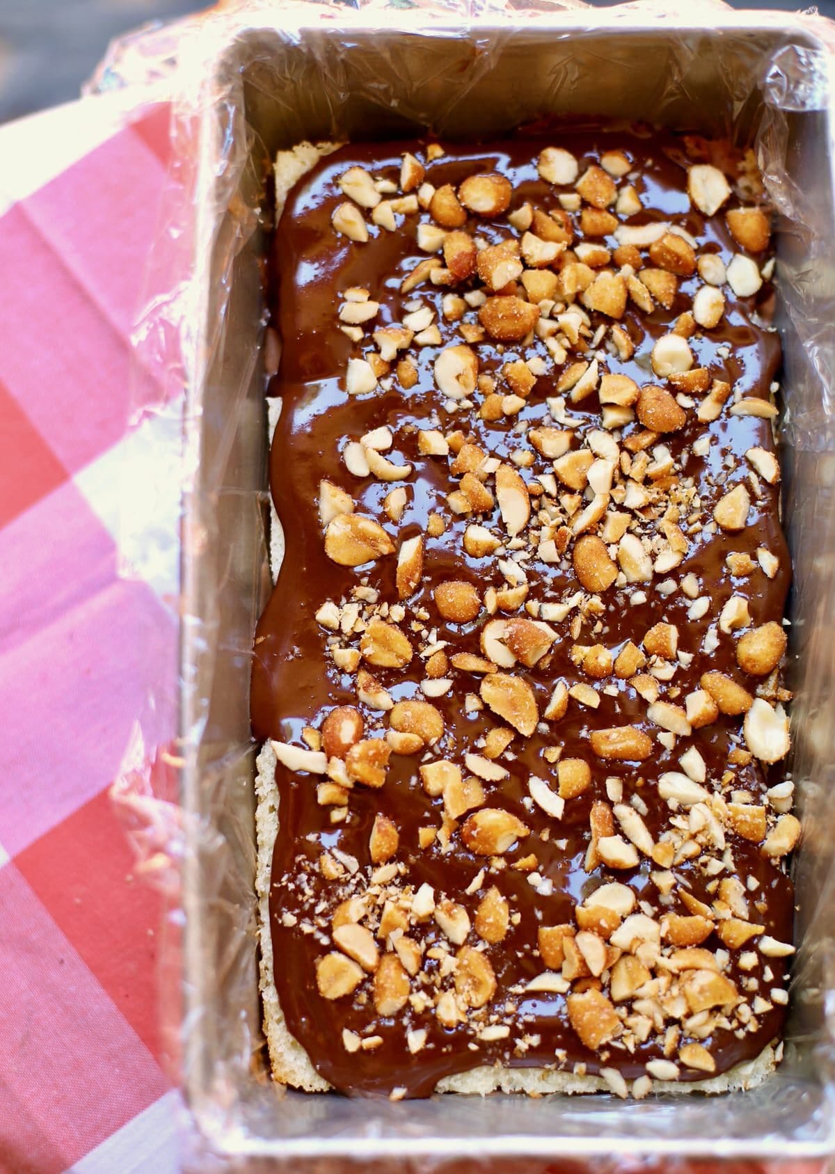 Remove from your freezer 15-20 minutes before serving, then slice and drizzle with a little more ganache, a few more peanuts and serve!