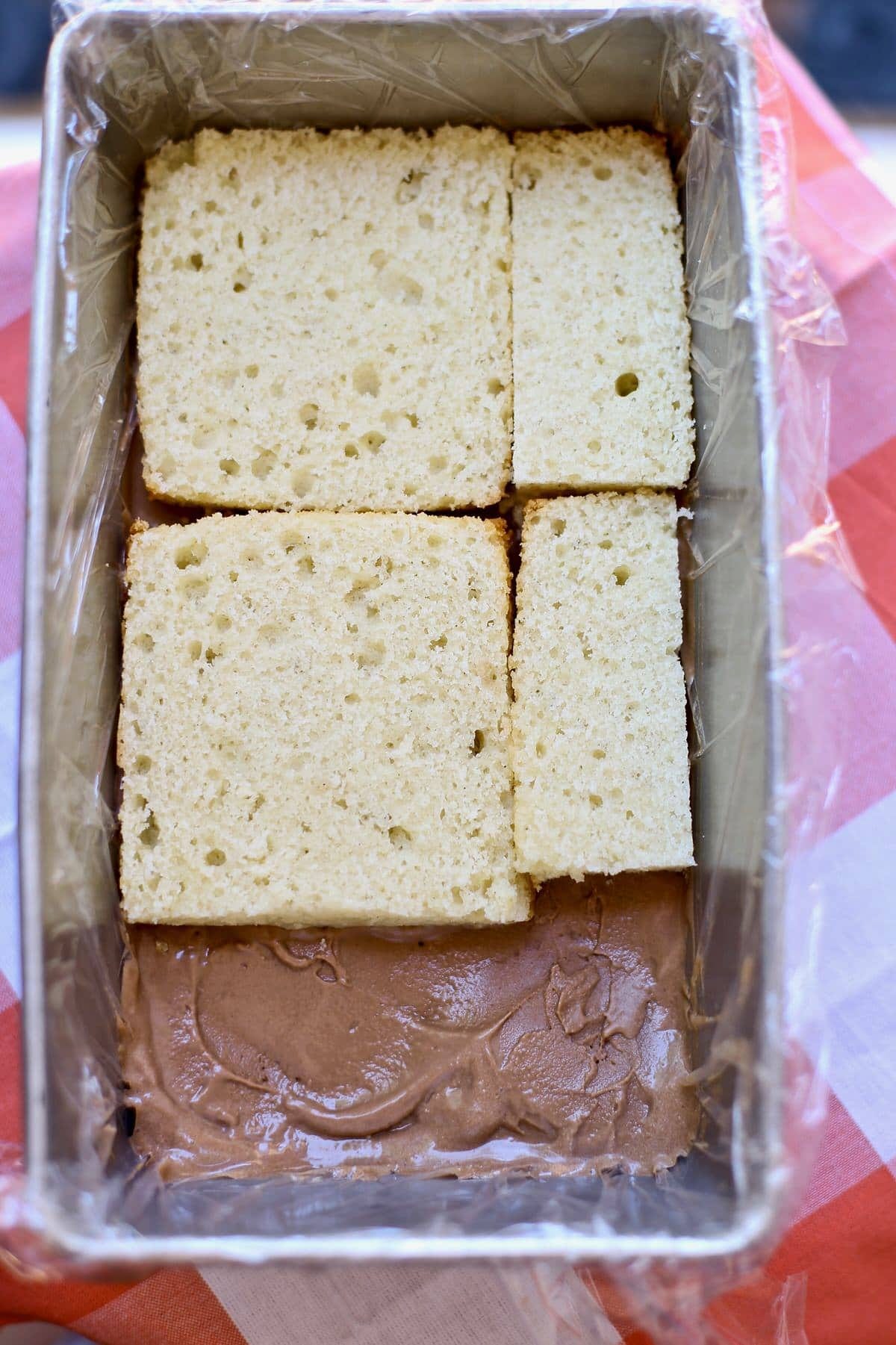 Cut the vanilla loaf cake into half-inch slices, then place on top of the chocolate ice cream in a single, even layer. You'll need to trim some smaller pieces to make the cake cover all the ice cream snugly.