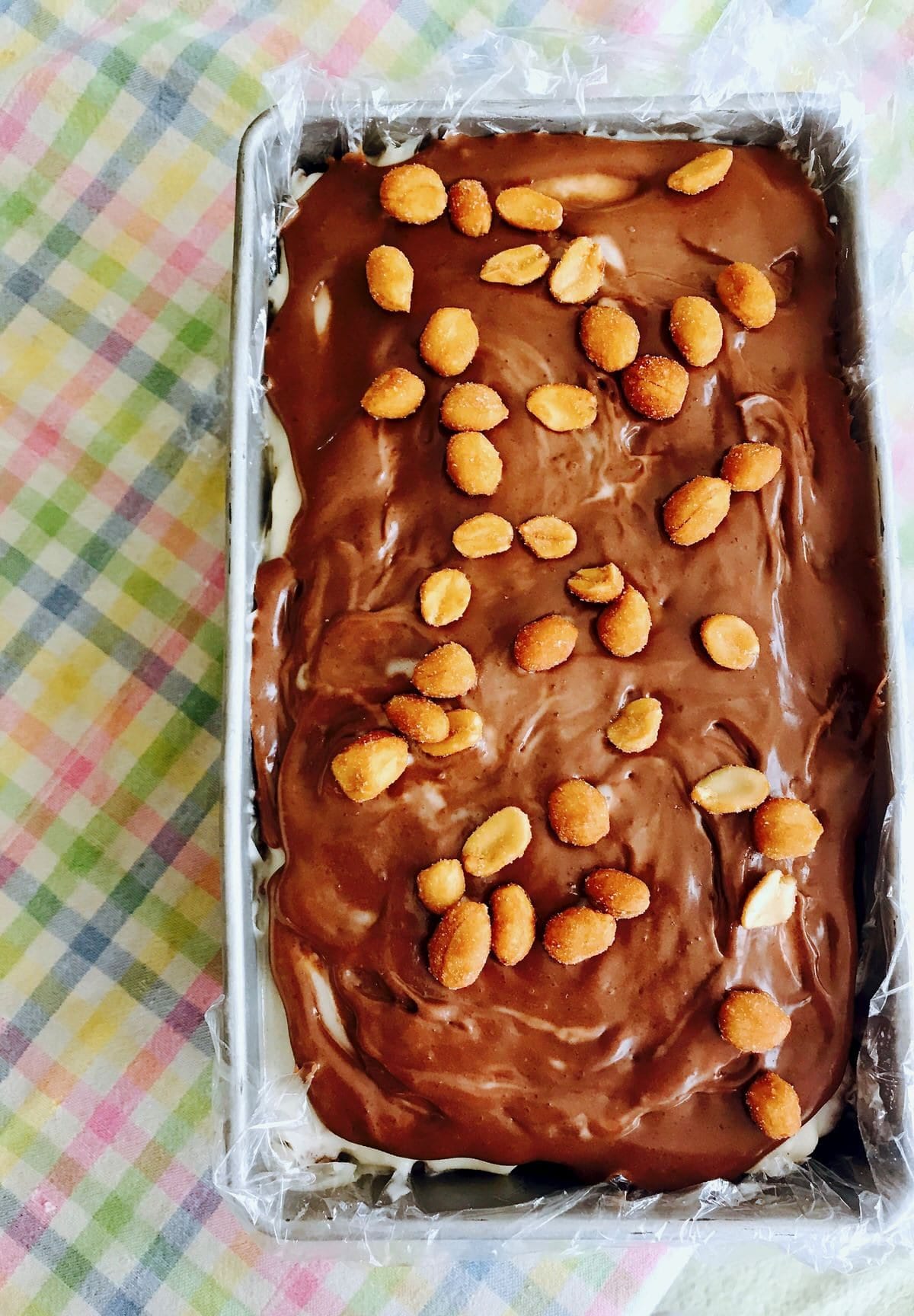 Add the softened chocolate ice cream to the loaf pan, and top with 1/2" slices of vanilla cake. Spoon some ganache and chopped peanuts on top of this and freeze for 30 minutes.