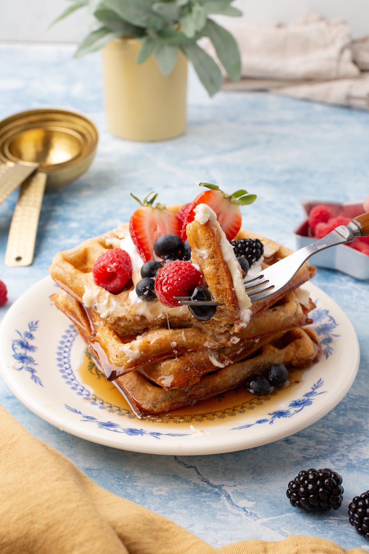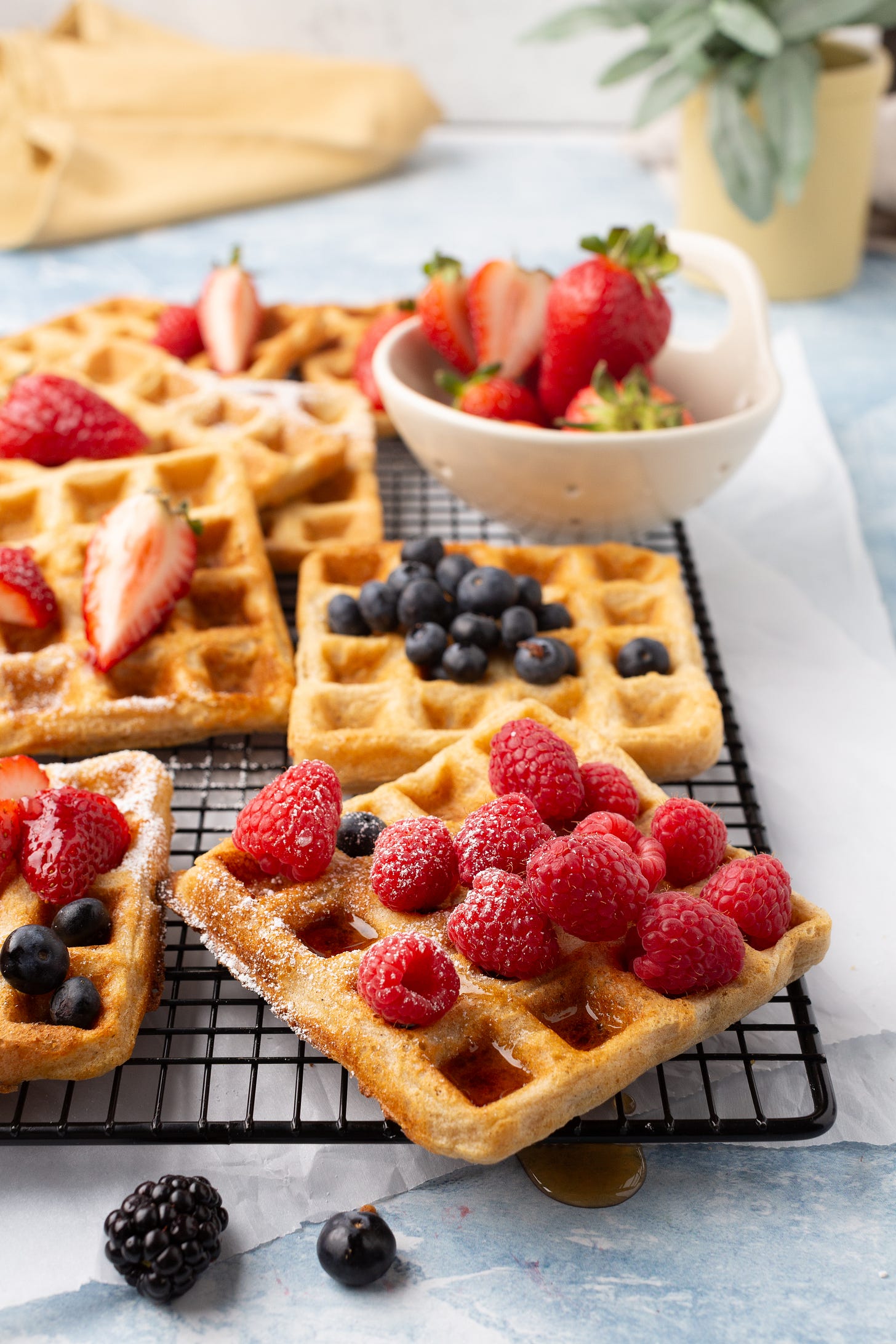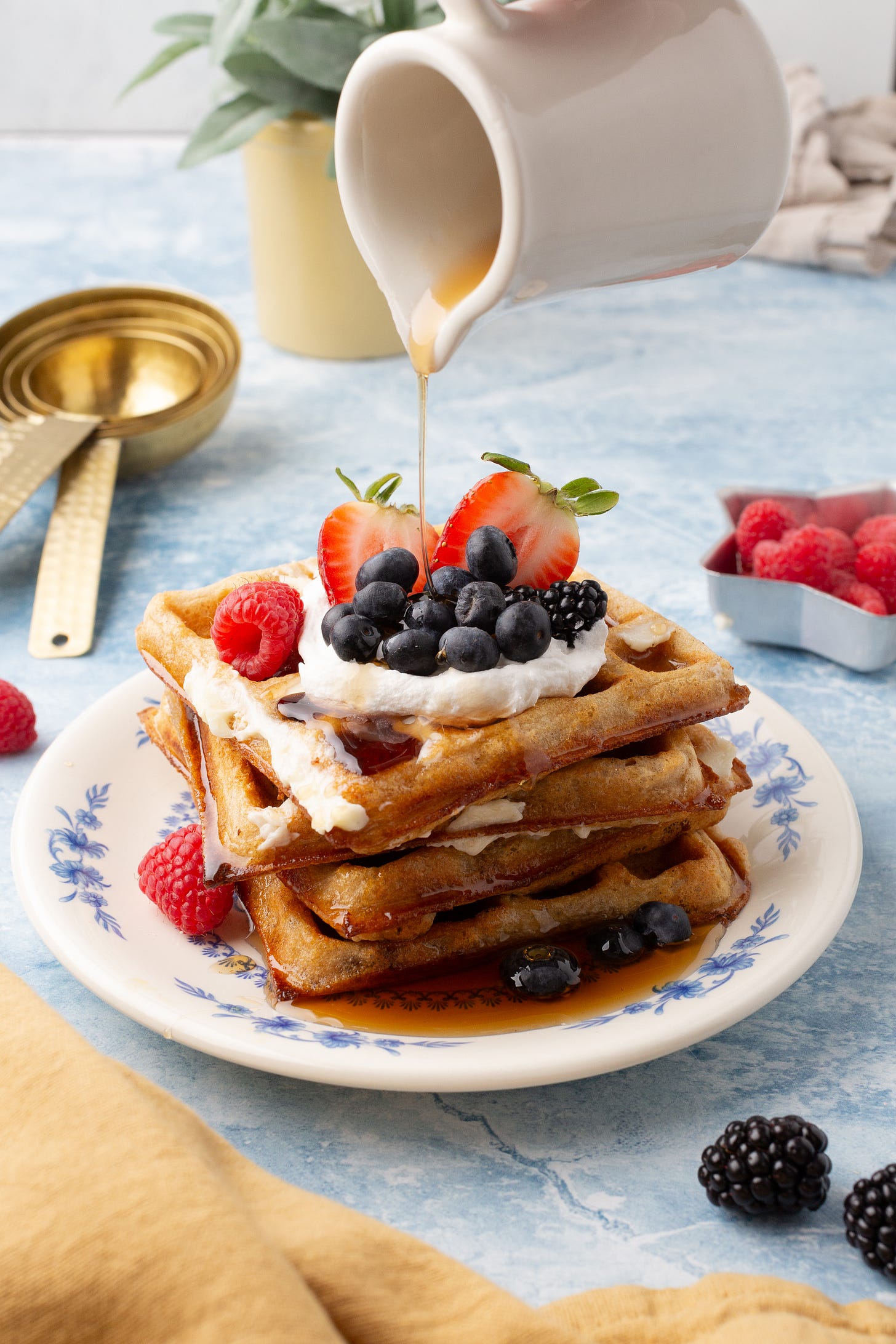 Cook these according to your waffle maker instructions. Serve the waffles hot with yogurt, butter, maple syrup and berries.