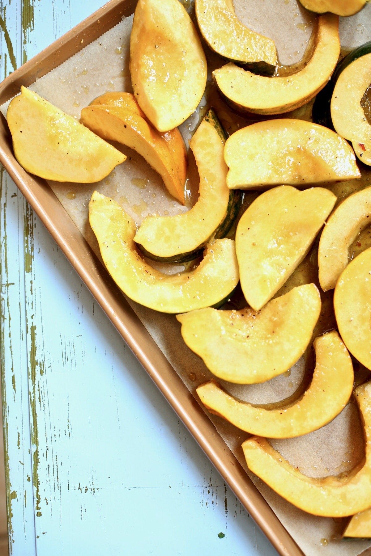 Place the squash pieces on a single layer on the baking sheet.