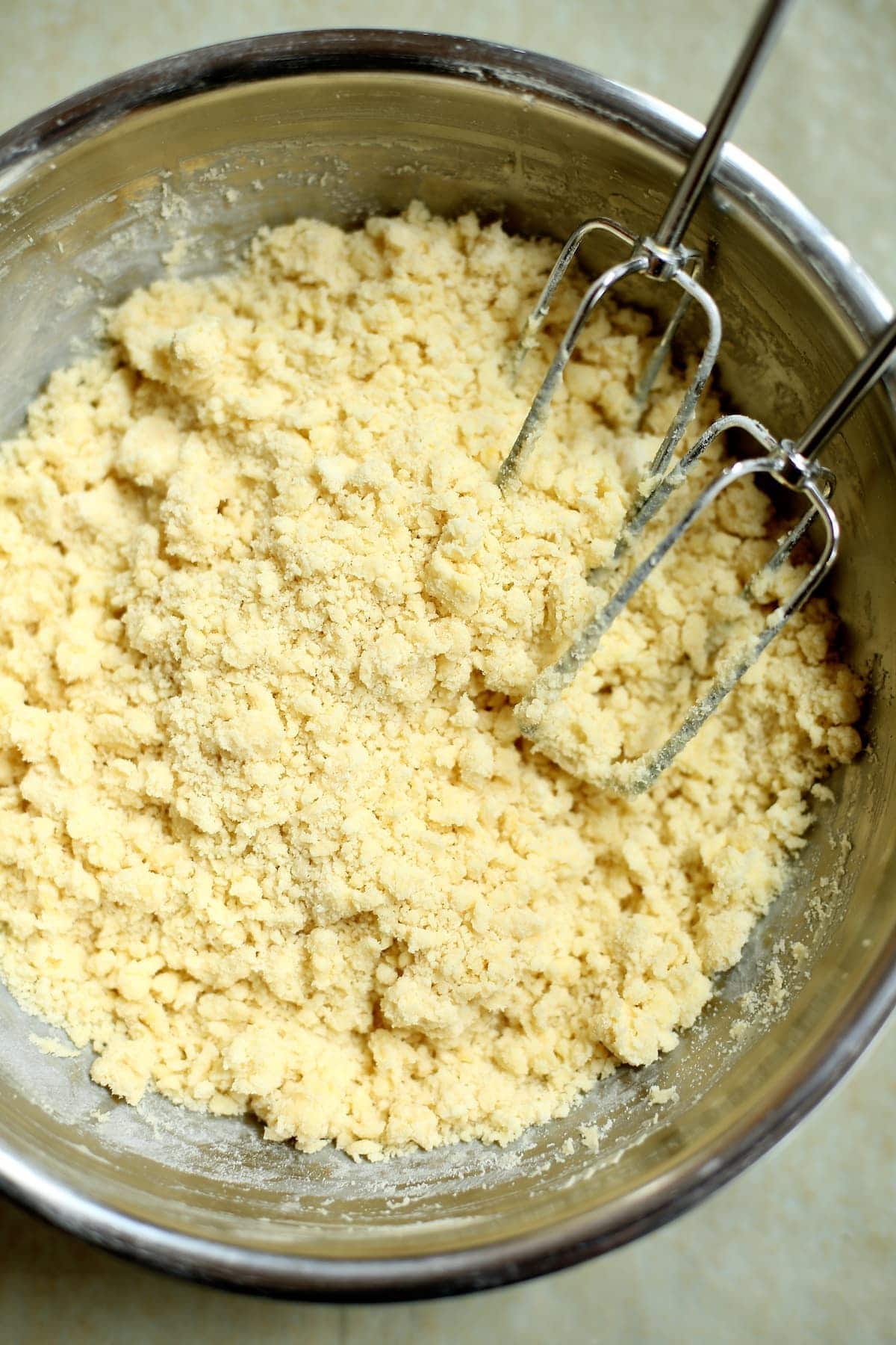 - Add the sifted, dry ingredients to the bowl with the butter mixture and do a quick mix on medium speed, just enough to have the ingredients hold together like in the photo above.
