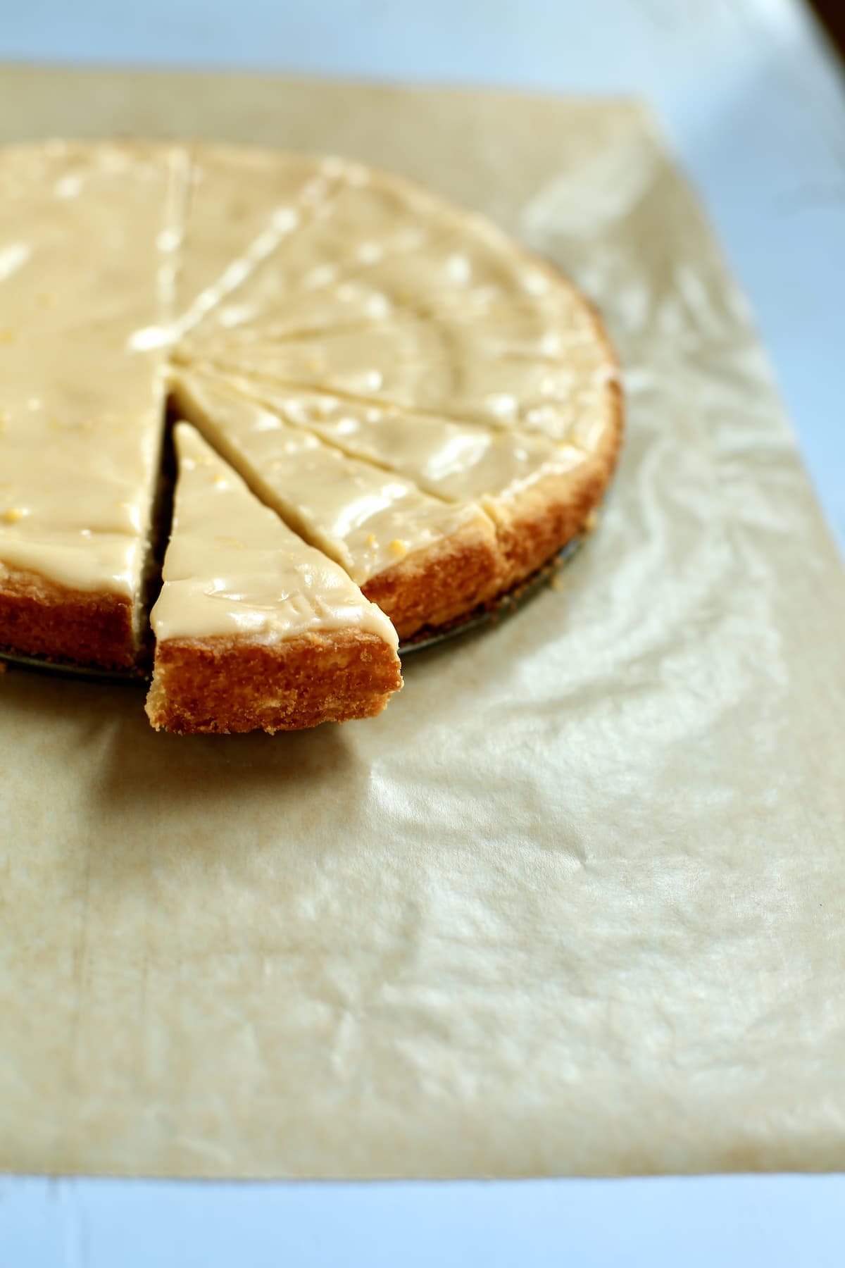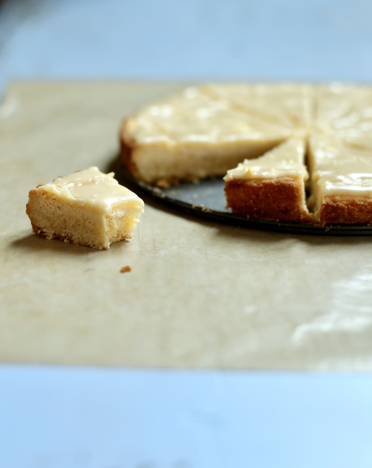 - Prep your baking sheet, add the shortbread dough, pat it down, bake, frost with lemon icing, then cool, slice and enjoy!