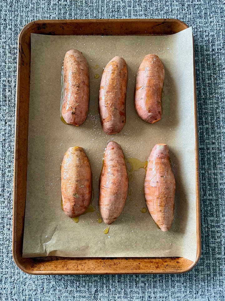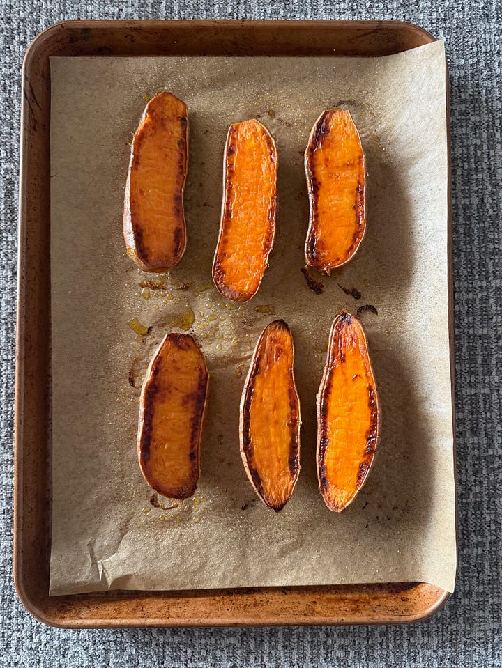 To make them, cut a sweet potato in half lengthwise, drizzle with olive oil, sprinkle both sides with a little salt, and bake cut-side down at 375°F until soft when pressed, about 30 minutes. So good.