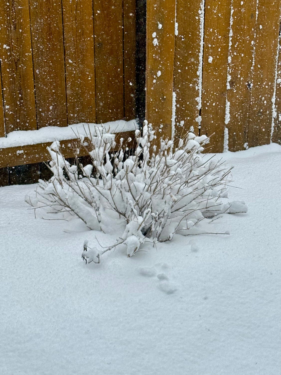 One of the poor backyard shrubs, bowed under the weight of the snow, already halfway to being buried.
